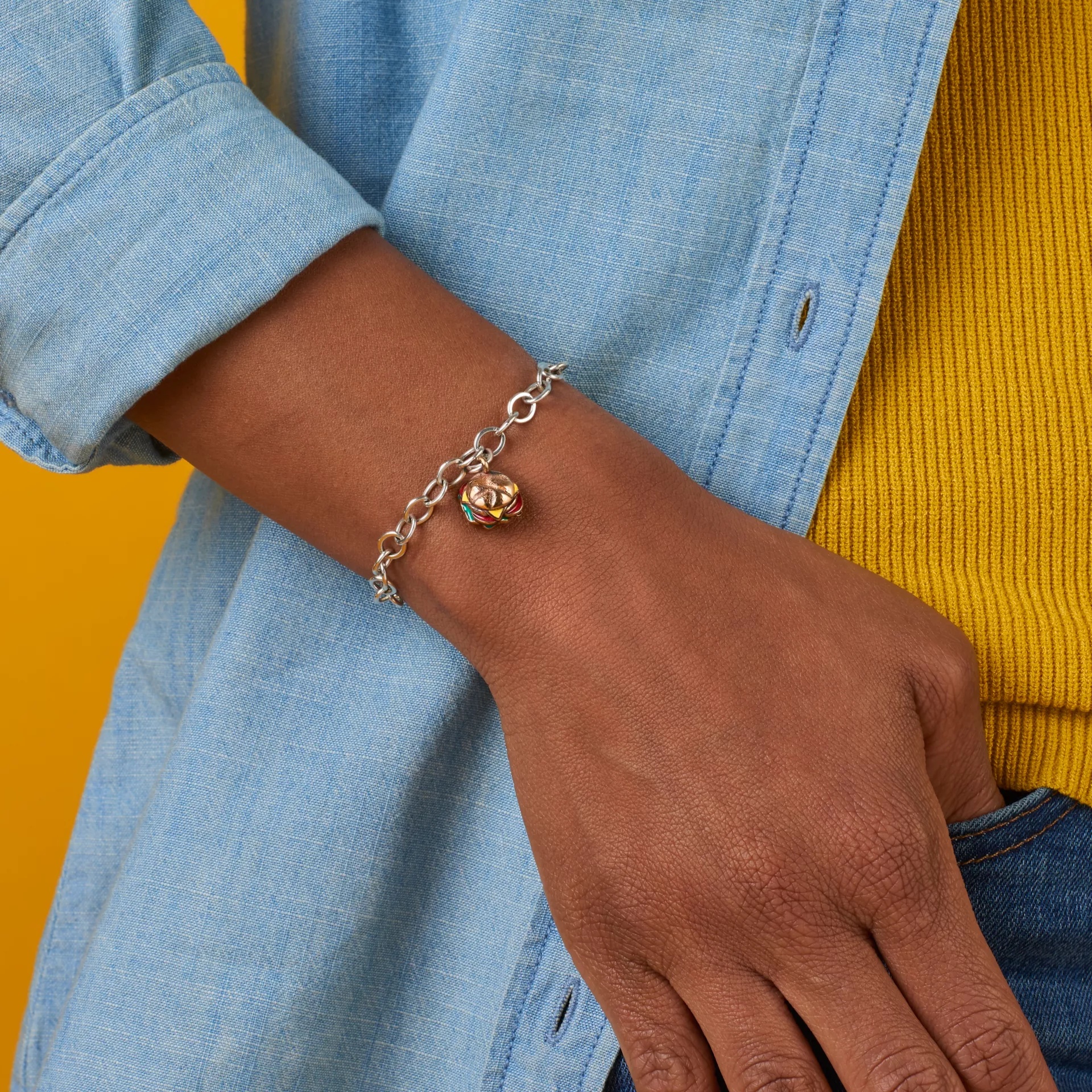 This design is retiring from our active line and once the remaining stock is sold, it will no longer be available. You want fries with that? This fun sterling silver cheeseburger charm features a bronze bun with vividly enameled melted cheese, fresh tomato and lettuce. It pairs especially well with any of our fast-food charms.